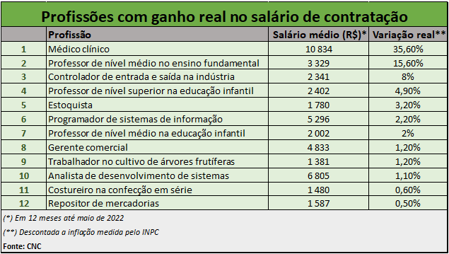 No topo das profissões que tiveram o maior aumento real estão os médicos clínicos. O salário de contratação desses profissionais teve um ganho real de 35,6% acima da inflação em um ano, com salário médio de contratação de R$ 10.834.